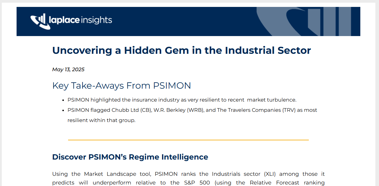 Uncovering a Hidden Gem in the Industrial Sector May 13, 2025 Key Take-Aways From PSIMON PSIMON highlighted the insurance industry as very resilient to recent  market turbulence.                 PSIMON flagged Chubb Ltd (CB), W.R. Berkley (WRB), and The Travelers Companies (TRV) as